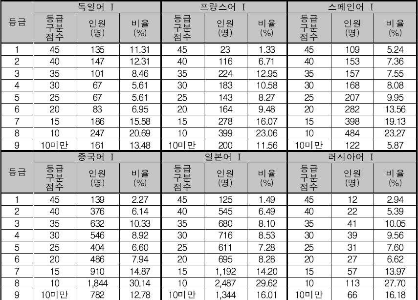 제2외국어 에서는 일본어의 인기가 가장 높은것 같습니다. 아무래도 우리나라와 매우 비슷한 문법을 가지고 있기 때문에 상대적으로 쉽게 공부를 할 수 있어서 수능 등급을 따기 위한 선택지로 인기가 있는데요. 일본어를 살펴보면 1등급의 비율은 1.49%로 매우 낮고, 그 다음 2~6등급의 비율이 비슷비슷하게 포진되어있습니다.