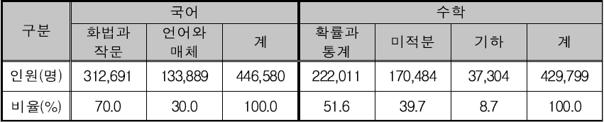 국어영역의 경우 화법과 작문을 선택한 응시자 비율이 70%이고 언어와매체를 선책한 수능 응시자는 30%로 집계 되었습니다. 수학의 경우에는 확률과 통계를 선택한 응시자가 51.6%, 미적분은 39.7% 그리고 기하를 선택한 응시자는 8.7% 입니다.