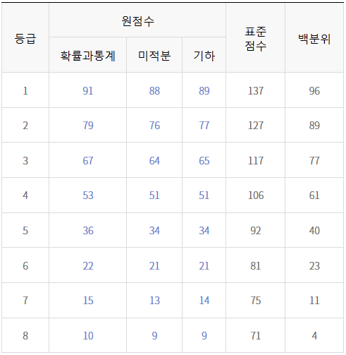 수학 수능 원점수 표준점수 백분위