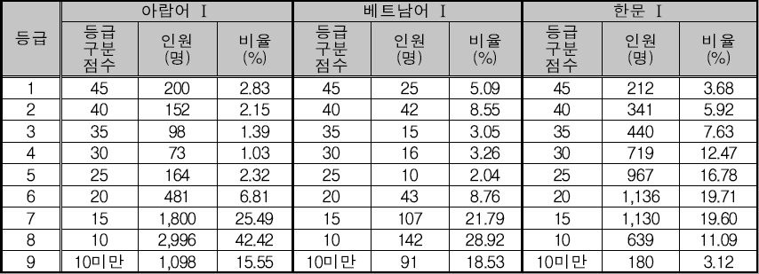 생활과 윤리, 윤리와 사상, 한국지리, 세계지리, 동아시아사, 세계사, 경제, 정치와 법, 사회문화 의 각 등급 구분점수와 인원, 비율 표입니다. 생활과 윤리 과목에 굉장히 많은 응시자가 몰려있네요. 생윤의 1등급과 2등급의 비율이 꽤 차이가 많이나는데요. 1등급은 10.07%, 2등급은 2.11% 그리고 다시 3등급은 10.97% 입니다.